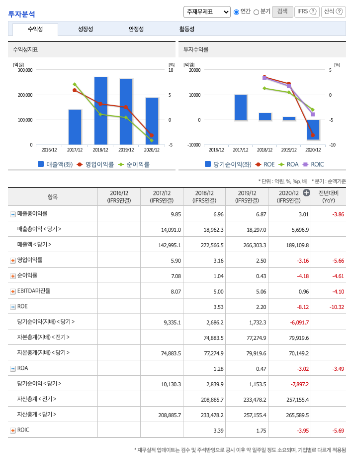 ROE(Return On Equity, 자기자본순이익율, 주주의 관점) : 2018년 약 3%, 2019년 약 2%, 2020년 약 -8%이고, 자기자본순이익율은 이상율(10%)보다 낮습니다.