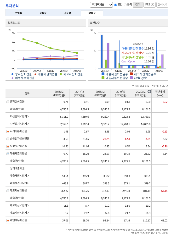 재고자산회전율(높을 수록 좋습니다) : 2018년 약 32억원, 2019년 약 29억원, 2020년 약 60억원이고, 회전율은 2018년 약 312%, 2019년 약 244%, 2020년 약 181%로 안정적입니다.