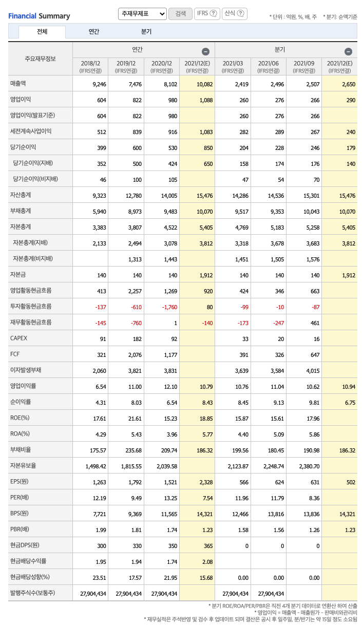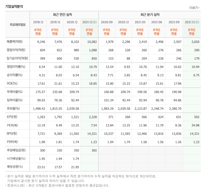 매출액 : 2018년 9246억원, 2019년 7476억원, 2020년 8102억원, 2021년 1,2,3분기 7422억원으로 전년동기대비 증가하였습니다. 2021년 3분기는 전년동기대비 27.8% 증가하였습니다. 2020년 분기별로 보면 4분기 2296억원, 2021년 1분기 2419억원, 2분기 2496억원, 3분기 2507억원입니다.