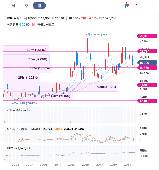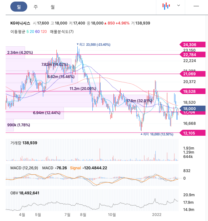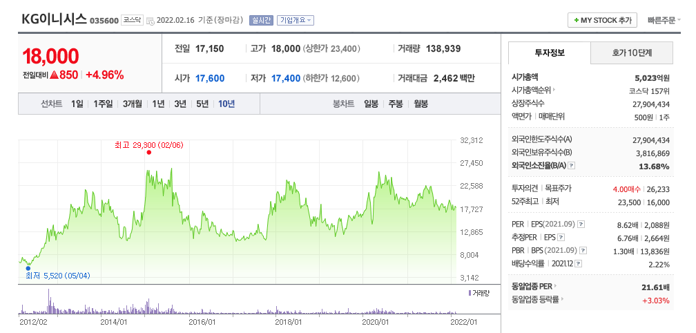 | KG이니시스 | 18,000원 | 18,603원 | 18,558원 | 18,294원 |