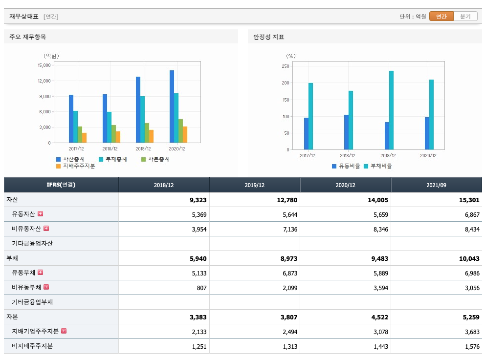 자산은 2018년 9323억원, 2019년 12,780억원, 2020년 14,005억원, 2021년 1,2,3분기 15,301억원으로 증가 하였습니다.