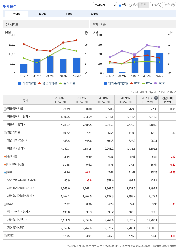 ROA(Return On Assets, 총자산순이익율, 경영자의 관점) : 2016년 약 2%, 2017년 약 0.36%, 2018년 약 4%, 2019년 약 5%, 2020년 약 3%이고, 총자산이익율은 이상율(10%)보다 낮습니다.