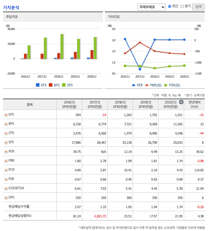 DPS(Dividend Per Share의 약자, 총배당금을 총주식발생수로 나눈 것, 한 주당 얼만큼의 배당금을 받을 수 있는지 알 수 있는 지표, DPS가 높을 수록 배당금이 많은 것임) : 2016년 250원, 2017년 250원, 2018년 300원, 2019년 330원, 2020년 350원으로 전년동기 하였습니다.