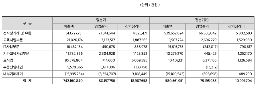 연결기업은 제공하는 재화나 용역에 근거하여 영업부문을 구분하고 각 부문의 재무정보를 내부관리목적으로 활용하고 있는 바 6개의 보고영업부문은 다음과 같습니다.