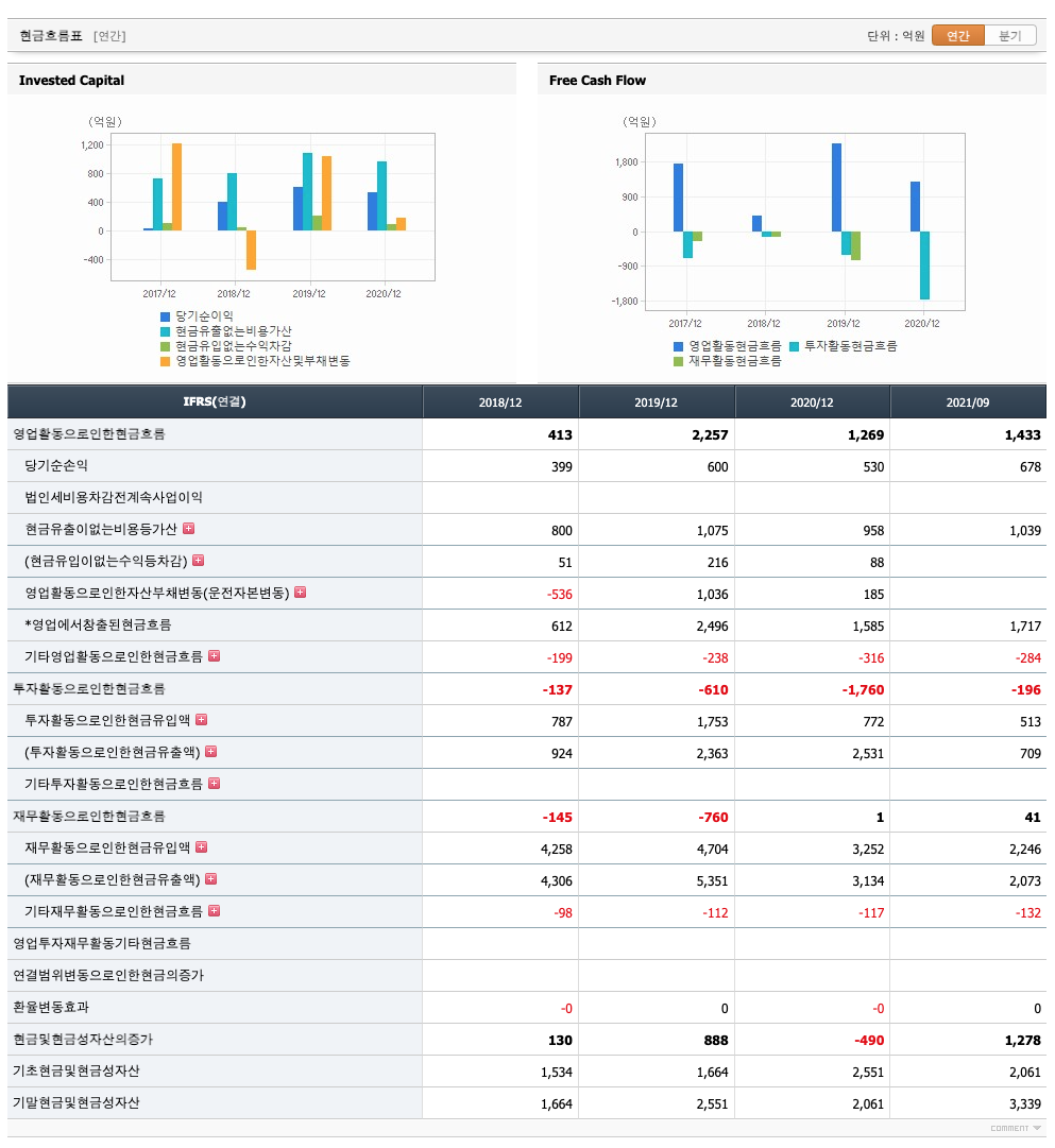 투자활동 현금흐름 : 2018년 -137억원, 2019년 -610억원, 2020년 -1760억원, 2021년 1,2,3분기 -196억원으로 투자활동 현금흐름이 원활합니다.