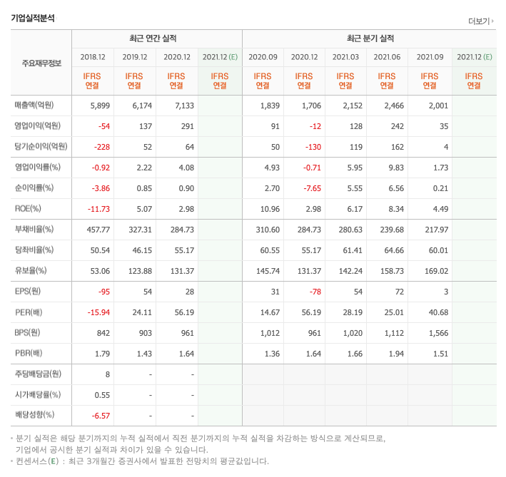 영업이익 : 2018년 -54억원, 2019년 137억원, 2020년 291억원, 2021년 1,2,3분기 405억원으로 전년동기대비 증가하였습니다. 2021년 3분기는 전년동기대비 33.6% 증가하였습니다. 2020년 분기별로 보면 4분기 -12억원, 2021년 1분기 128억원, 2분기 242억원, 3분기 35억원입니다.