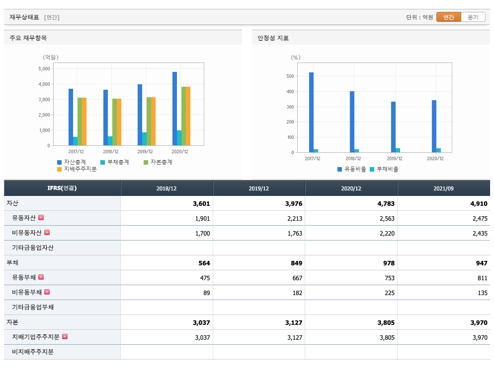 자산은 2018년 3601억원, 2019년 3976억원, 2020년 4783억원, 2021년 1,2,3분기 4910억원으로 증가 하였습니다.