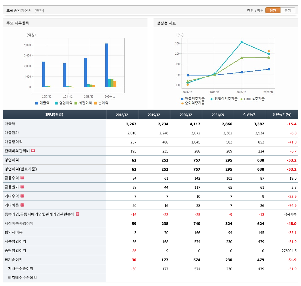 매출액 : 2018년 2267억원, 2019년 2734억원, 2020년 4117억원, 2021년 1,2,3분기 2866억원으로 전년동기대비 감소하였습니다. 2021년 3분기는 전년동기대비 -15.4% 감소하였습니다. 2020년 분기별로 보면 4분기 729억원, 2021년 1분기 1021억원, 2분기 1063억원, 3분기 781억원입니다.