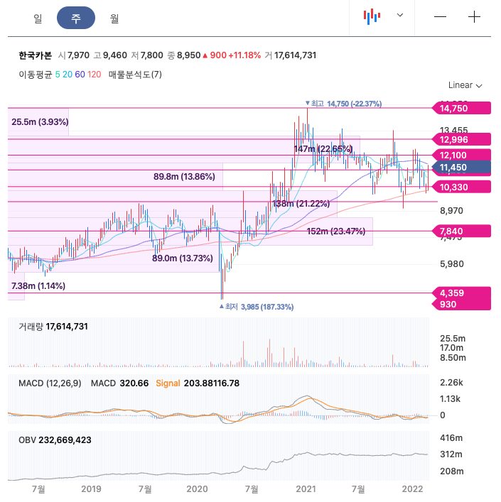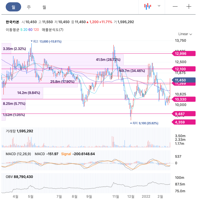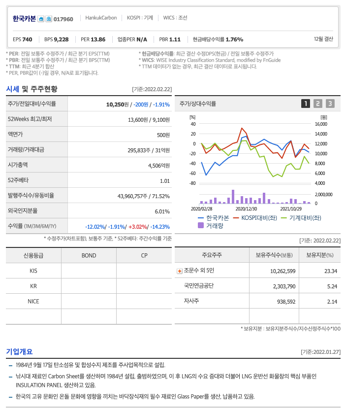 한국카본의 주가는 20년 8월 급등하여 21년 1월 최고 14,750원을 찍고 조정을 받았습니다.