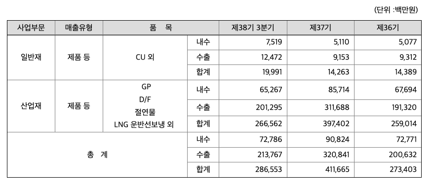 LNG사업의 경우 국내 MARKⅢ / MARK FLEX 타입 LNG INSULATION PANEL 제작업체는 당사와 동성화인텍이 있으며, 당사와 동성화인텍 모두 삼성중공업과 현대중공업이 건조하는 MEMBRANE형 LNG운반선 화물창에 사용되는 INSULATION PANEL을 공급하고 있습니다. 당사는 LNG INSULATION PANEL의 2차 방벽인 RIGID TRIPLEX와 FLEXIBLE TRIPLEX를 국산화하여 MARKⅢ / MARK FLEX TYPE LNG INSULATION PANEL용 2차방벽을 일괄 공급할 수 있는 유일한 기업이며, 선주의 LNG선박 운영시 비용절감에 기여하는 자연기화율의 저감을 위해, 신기술을 적용한 R-PUF의 개발로 시장경쟁력을 강화하고 있습니다. 탄소섬유/유리섬유 복합소재사업 영위회사는 당사와 도레이첨단소재 등이 있으며, 글라스페이퍼 시장은 국내 안정적인 PVC바닥재 시장을 확보함으로서 안정적인 시장점유율을 유지하고 있습니다.