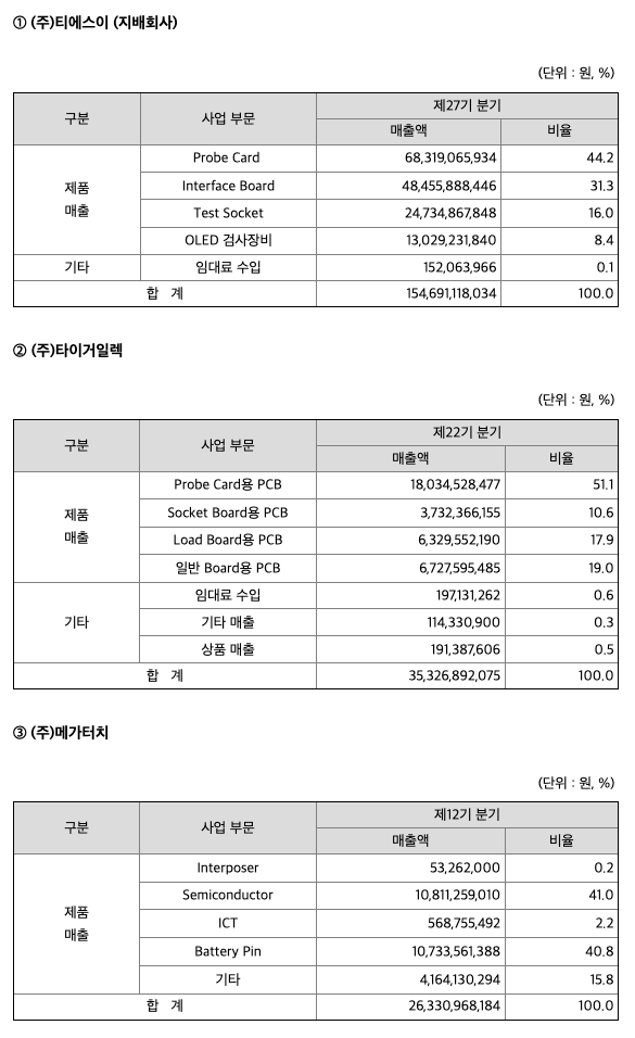 당사는 반도체 및 디스플레이 검사장비 전문 기업으로써, 반도체 웨이퍼(Wafer) 상태에서의Test를 위한 핵심 장치인 Probe Card, Package 검사단계에서의 핵심 역할을 하는 Test Interface Board 및Test socket, OLED 검사장비를 생산 및 판매하고 있습니다. 또한LED의 전기적/광학적 특성을 검사하기 위한Total Test Solution을 제공합니다. 당사의 사업 중Probe Card와 Test Interface Board, Test Socket은 반도체산업에 속해 있으며, OLED/LED 검사장비는 디스플레이 산업에 속해 있습니다.