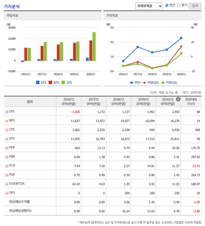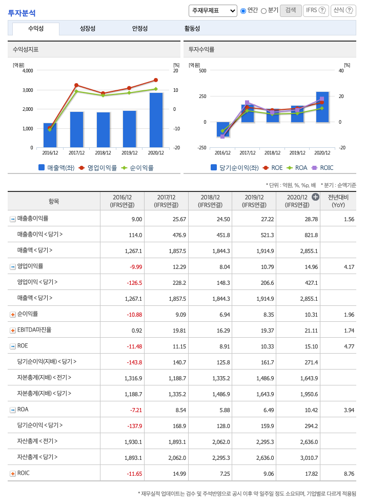 ROE(Return On Equity, 자기자본순이익율, 주주의 관점) : 2016년 약 -11%, 2017년 약 11%, 2018년 약 8%, 2019년 약 10%, 2020년 약 15%이고, 자기자본순이익율은 이상율(10%)보다 높습니다.
