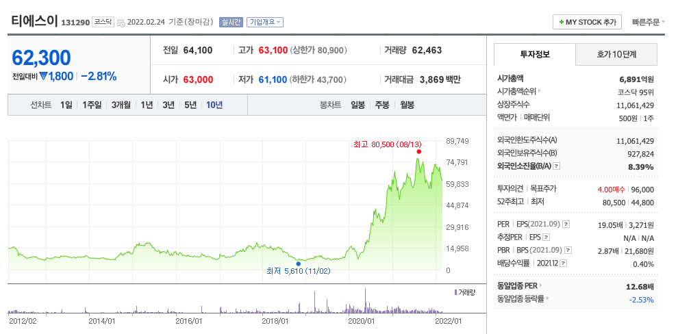 티에스이의 주가는 21년 3월 반등하여 증가하였고 21년 8월 최고 80,500원을 찍고 조정을 받고, 보합중에 있습니다.