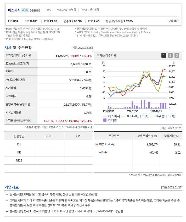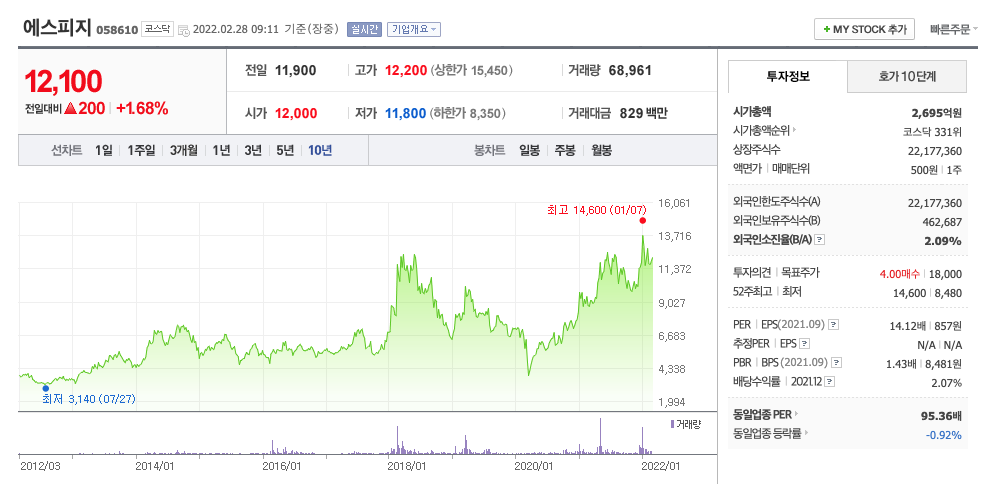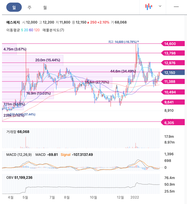 에스피지의 주가는 21년 4월 급등하였고, 이후 보합상태였다가 22년 1월 최고 14,600원을 찍고 조정을 받았습니다.