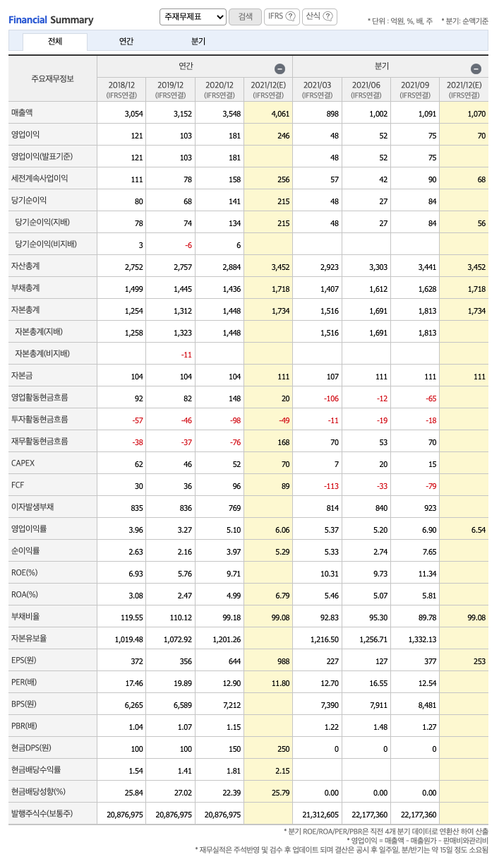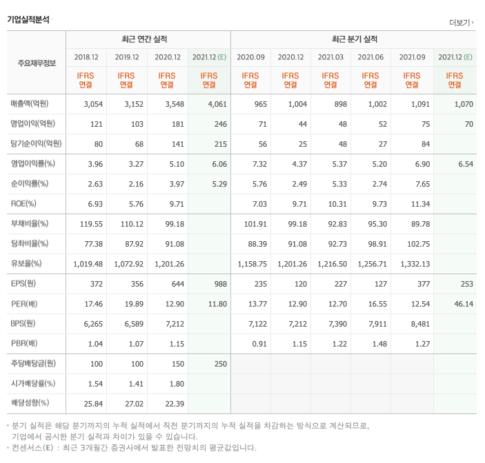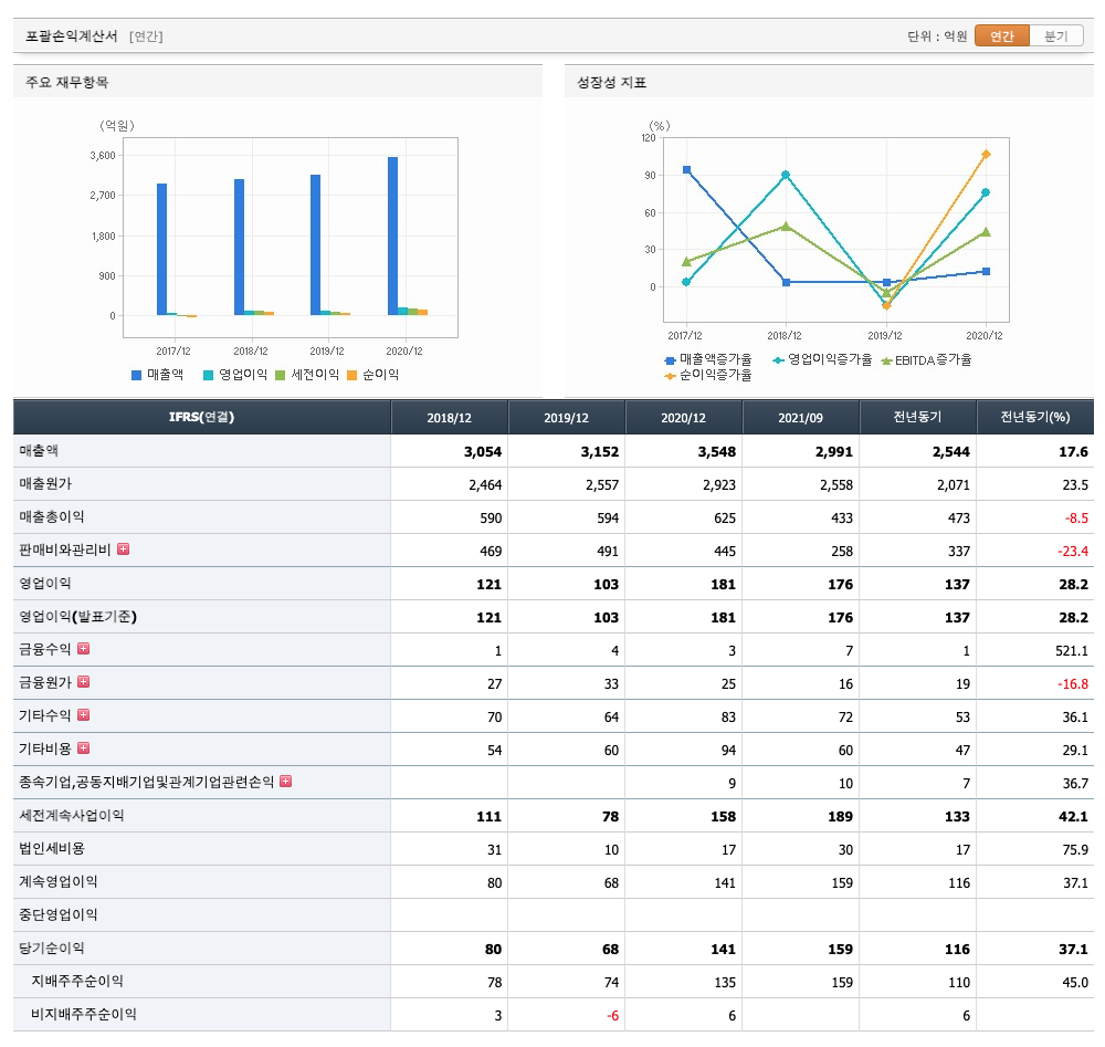 매출액 : 2018년 3054억원, 2019년 3152억원, 2020년 3548억원, 2021년 1,2,3분기 2991억원으로 전년동기대비 증가하였습니다. 2021년 3분기는 전년동기대비 17.6% 증가하였습니다. 2020년 분기별로 보면 4분기 1004억원, 2021년 1분기 898억원, 2분기 1002억원, 3분기 1091억원입니다.