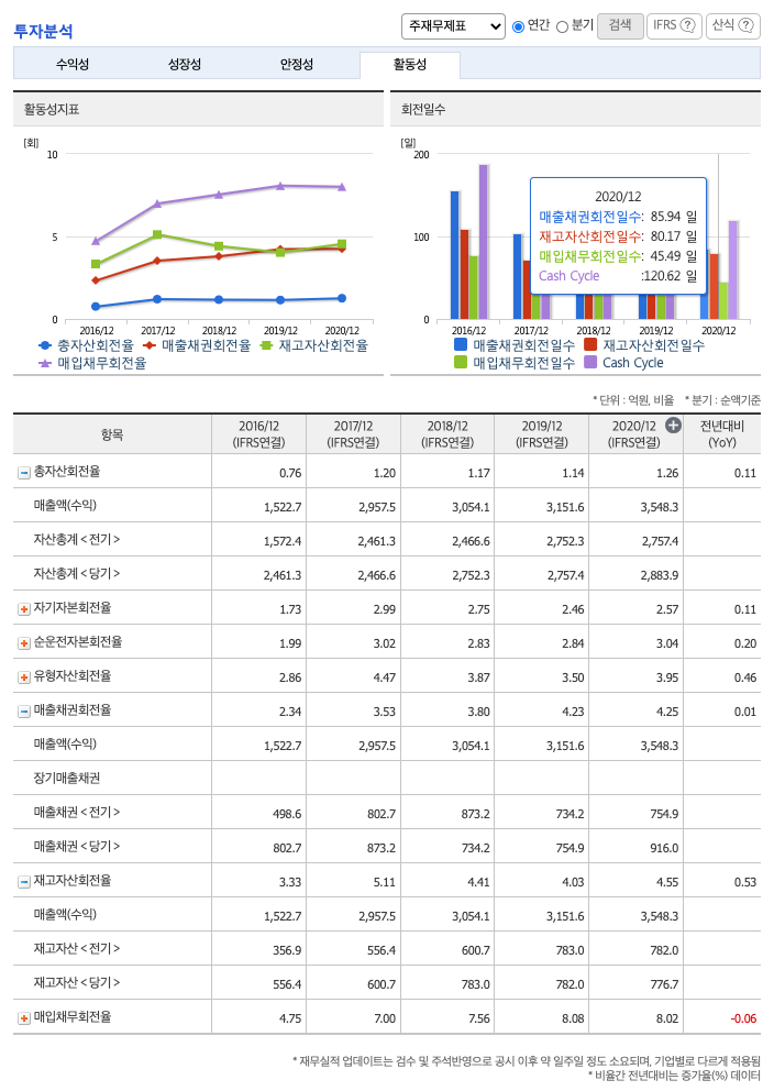 재고자산회전율(높을 수록 좋습니다) : 2018년 약 783억원, 2019년 약 782억원, 2020년 약 776억원이고, 회전율은 2018년 약 4%, 2019년 약 4%, 2020년 약 4%로 안정적입니다.