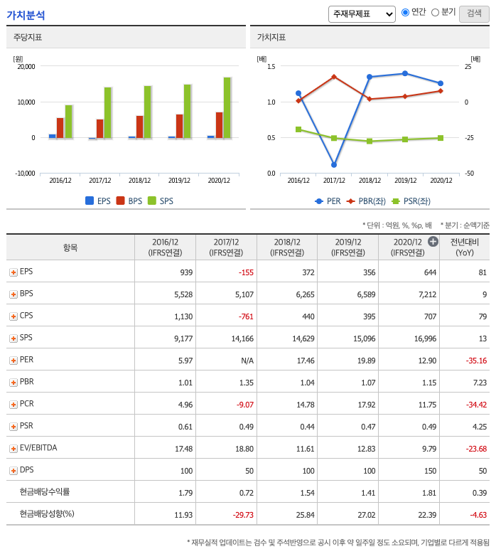 DPS(Dividend Per Share의 약자, 총배당금을 총주식발생수로 나눈 것, 한 주당 얼만큼의 배당금을 받을 수 있는지 알 수 있는 지표, DPS가 높을 수록 배당금이 많은 것임) : 2016년 100원, 2017년 50원, 2018년 100원, 2019년 100원, 2020년 150원으로 전년동기 증가하였습니다.