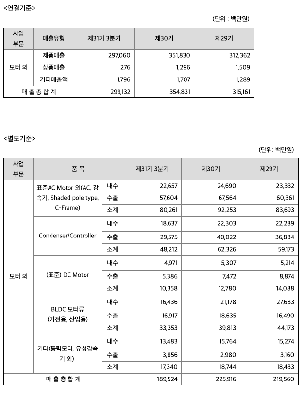 또한 당사는 진정한 Global 모터업체로 발돋움 하기 위해 지난 2016년 11월 30일 국내 최대 FAN 모터 제조업체인 ㈜ 성신을 흡수 합병하여 약 48년이 넘는 결코 짧지 않은 소형모터의 제조 기술 및 노하우를 확보하게 되었습니다. ㈜ 성신이 영위한 주요사업은 냉장고, 오븐, 에어컨, 식기세척기 등 가전기기에 사용되는 소형모터(AC Motor, BLDC Motor 등), Outer Rotor Motor (Axial Fan type, Siroco Fan type 등), 송풍기 및 에어커튼을 생산ㆍ판매하고 있습니다. 특히 해당 제품들은 높은 기술력과 다양한 수요처, 가전특성상 지속적인 신규제품 개발 및 대체 수요 확보로 인해 경기 변동 민감도가 낮은 편에 속하는 사업구조를 가지고 있습니다. 또한 가전제품의 개발단계에서부터 참여하여 해당 가전제품에서 요구하는 다양한 스펙에 맞는 모터를 생산하고 있으며, 현재 약 900개의 기종을 생산하고 있습니다. 매출비중은 국내가 약 36%, 미주와 유럽지역에서 약 28%가 발생하며 이외에 중국, 동남아시아 등에서 발생하고 있습니다.