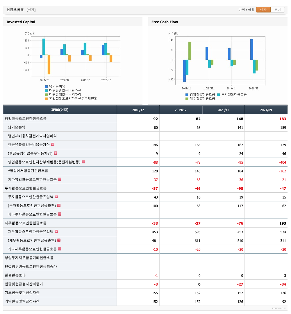 영업활동 현금흐름 : 2018년 92억원, 2019년 82억원, 2020년 148억원, 2021년 1,2,3분기 -183억원으로 2020년까지 영업활동 현금흐름이 원활합니다.