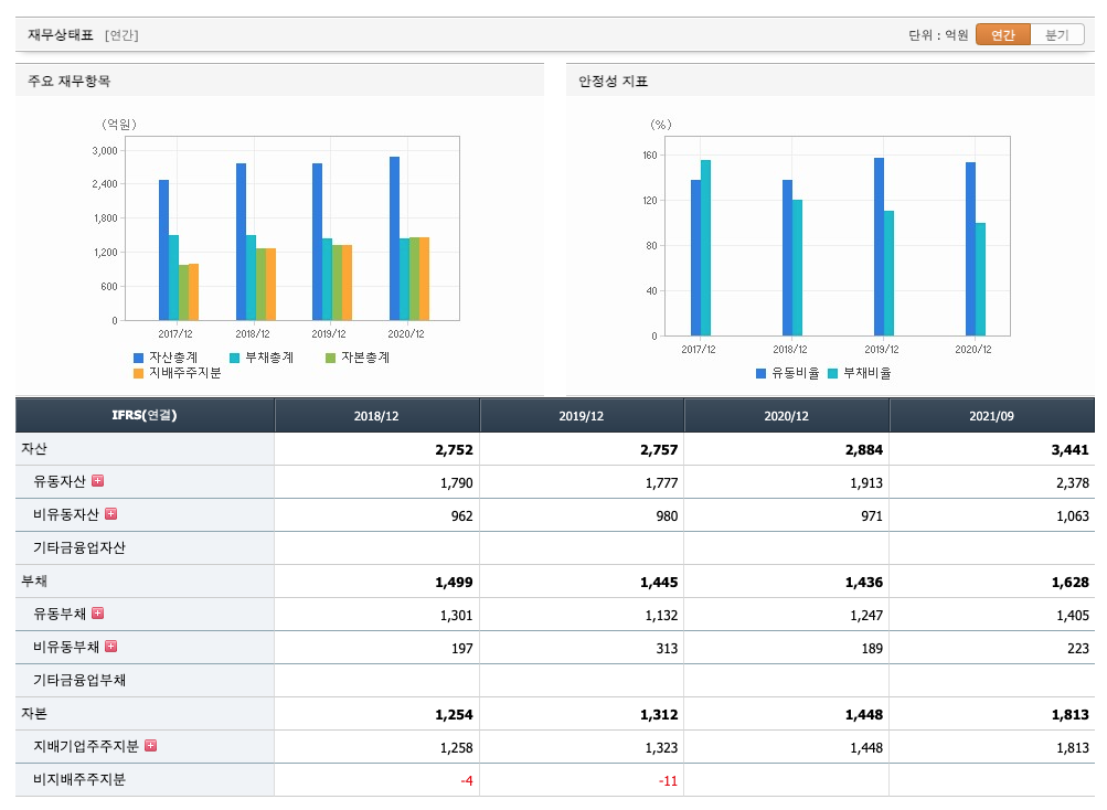 자산은 2018년 2752억원, 2019년 2757억원, 2020년 2884억원, 2021년 1,2,3분기 3441억원으로 증가 하였습니다.