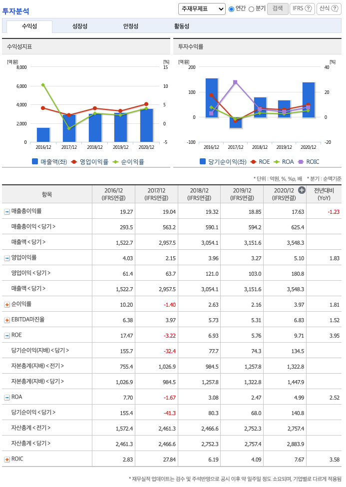 ROA(Return On Assets, 총자산순이익율, 경영자의 관점) : 2016년 약 7%, 2017년 약 -1.67%, 2018년 약 3%, 2019년 약 2%, 2020년 약 4%이고, 총자산이익율은 이상율(10%)보다 낮습니다.