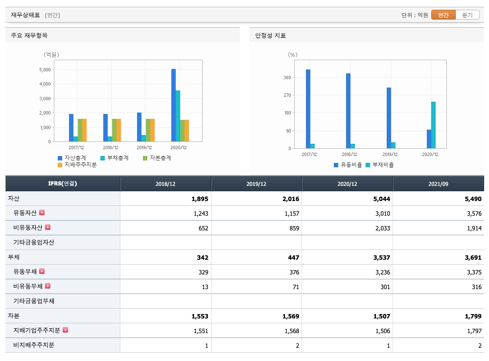 재무활동 현금흐름 : 2018년 -90억원, 2019년 -100억원, 2020년 413억원, 2021년 1,2,3분기 -39억원으로 2018년과 2019년과 2021년 3분기의 재무활동 현금흐름은 마이너스, 2020년의 재무활동 현금흐름은 플러스입니다.
