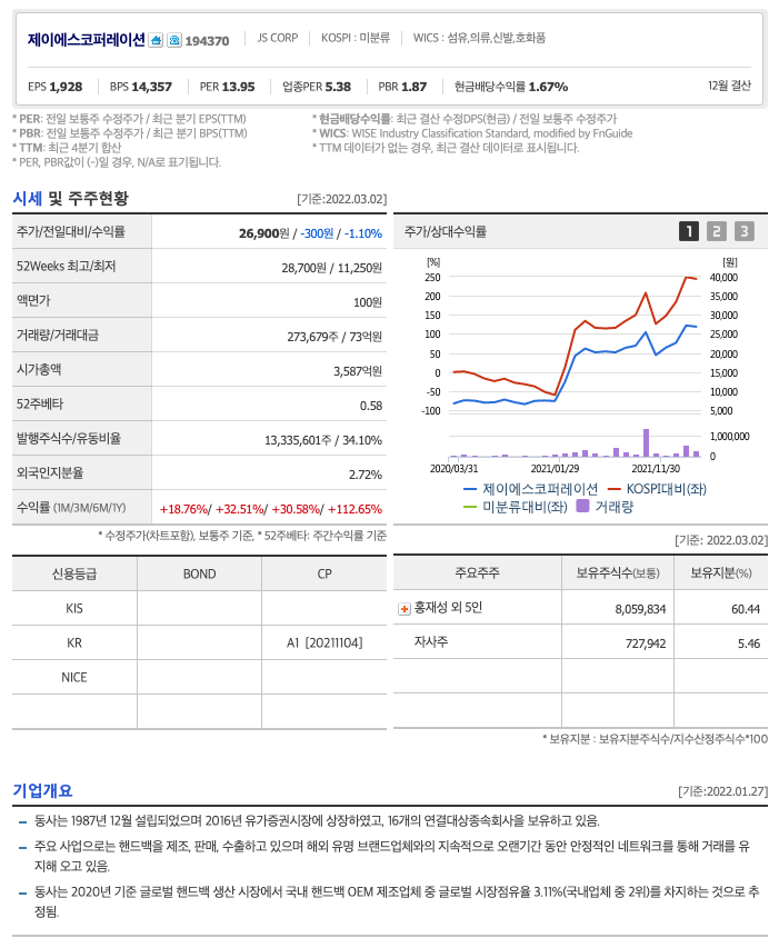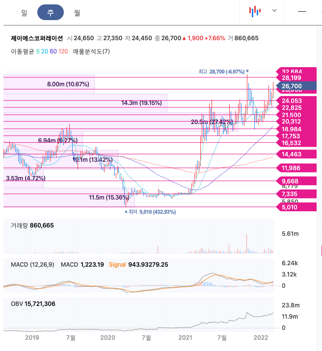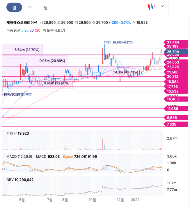 제이에스코퍼레이션의 주가는 21년 2월부터 증가하여 21년 10월 최고 28,700원을 찍고, 조정후 재상승하고 있습니다.