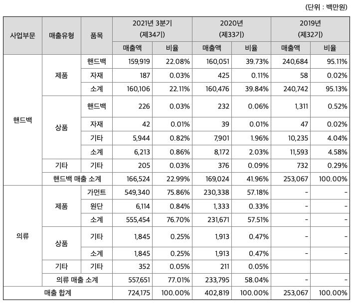 당사가 영위하고 있는 핸드백 생산 시장은 국내외의 공신력 있는 기관이 발표한 시장점유율과 관련된 자료가 없습니다. 또한, 업체별로 다수의 브랜드들을 보유, 각 브랜드별로 수많은 제품라인을 보유하고 있는 상황이며, 브랜드의 자체 생산, OEM 제조업체를 통한 생산 등으로 시장점유율 산출에 어려움이 있습니다. 당사는 Global Handbags Market Report(2015 Edition, Koncept Analytics)의 핸드백 및 액세서리 글로벌 시장 규모를 토대로 핸드백 제조 시장 규모를 산출하였으며, 국내 유명 핸드백 OEM 제조업체를 조사하여 당사 자체 추정으로 시장점유율을 산정하였습니다. 당사는 2020년 기준 글로벌 핸드백 생산 시장에서 국내 핸드백 OEM 제조업체 중 글로벌 시장점유율 3.11%(국내업체 중 2위)를 차지하는 것으로 추정됩니다.