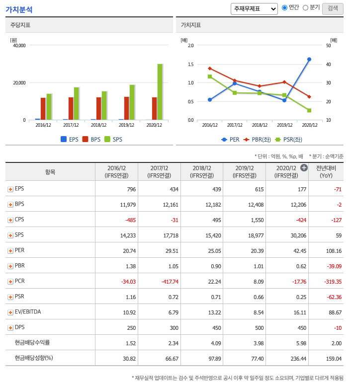 DPS(Dividend Per Share의 약자, 총배당금을 총주식발생수로 나눈 것, 한 주당 얼만큼의 배당금을 받을 수 있는지 알 수 있는 지표, DPS가 높을 수록 배당금이 많은 것임) : 2016년 250원, 2017년 300원, 2018년 450원, 2019년 500원, 2020년 450원으로 전년동기 감소하였습니다.