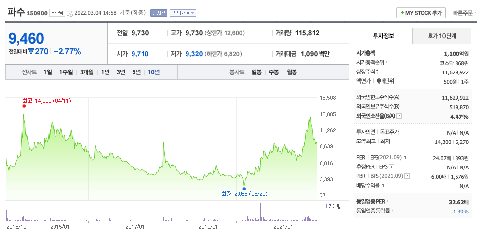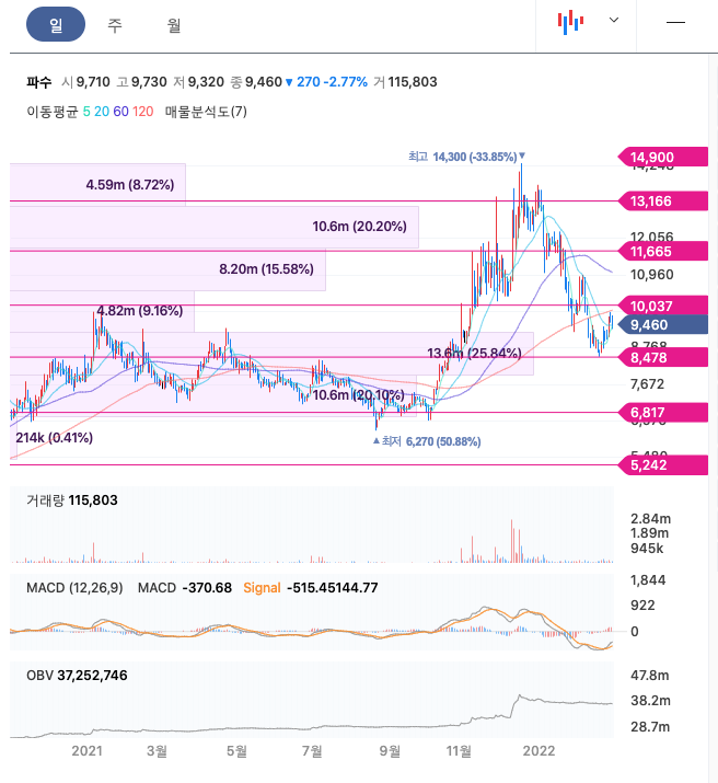 파수의 주가는 21년 10월에 급등하여 21년 12월 14,300원을 찍고 조정을 받았습니다.