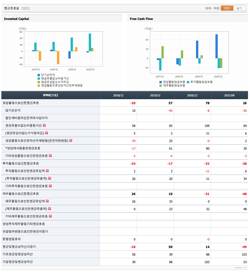 투자활동 현금흐름 : 2018년 -24억원, 2019년 -17억원, 2020년 -32억원, 2021년 1,2,3분기 -28억원으로 투자활동 현금흐름이 원활합니다.
