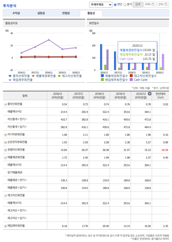 매출채권회전율(높을 수록 좋습니다) : 2018년 약 189억원, 2019년 약 168억원, 2020년 약 138억원이고, 회전율은 2018년 약 1%, 2019년 약 1%, 2020년 약 2%로 안정적입니다.