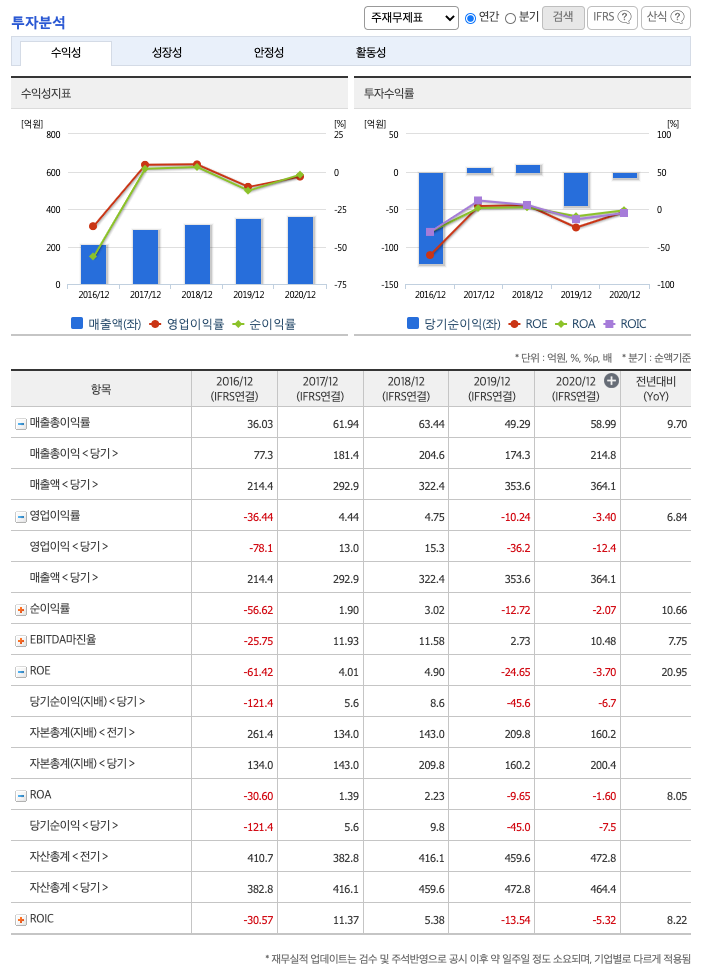 ROE(Return On Equity, 자기자본순이익율, 주주의 관점) : 2016년 약 -61%, 2017년 약 4%, 2018년 약 4%, 2019년 약 -24%, 2020년 약 -3%이고, 자기자본순이익율은 이상율(10%)보다 낮습니다.