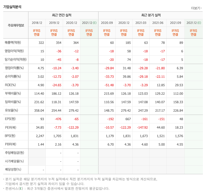 영업이익 : 2018년 15억원, 2019년 -36억원, 2020년 -12억원, 2021년 1,2,3분기 -30억원으로 전년동기대비 적자지속하였습니다. 2020년 분기별로 보면 4분기 58억원, 2021년 1분기 -18억원, 2분기 -17억원, 3분기 6억원입니다.