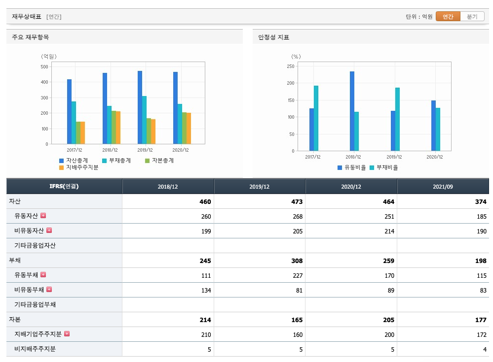 자본은 2018년 214억원, 2019년 165억원, 2020년 205억원, 2021년 1,2,3분기 177억원으로 감소 하였습니다.