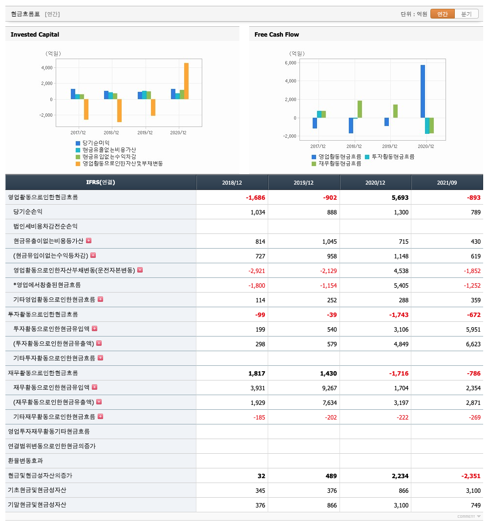 영업활동 현금흐름 : 2018년 -1686억원, 2019년 -902억원, 2020년 5693억원, 2021년 1,2,3분기 -893억원으로 2020년의 영업활동 현금흐름이 원활합니다.