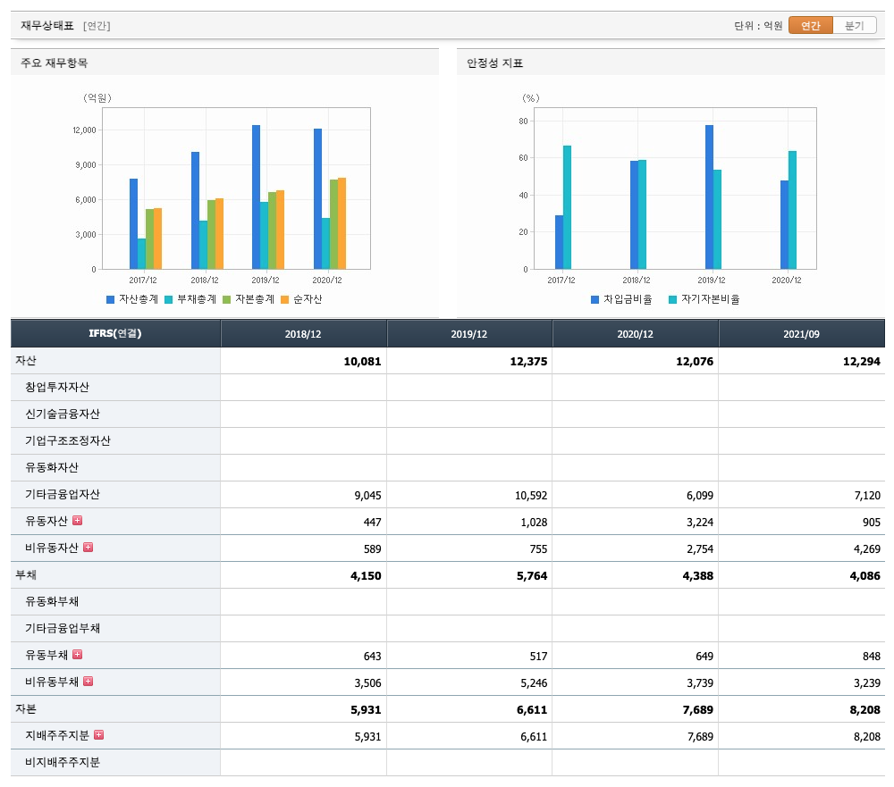 자본은 2018년 5931억원, 2019년 6611억원, 2020년 7689억원, 2021년 1,2,3분기 8208억원으로 증가하였습니다.