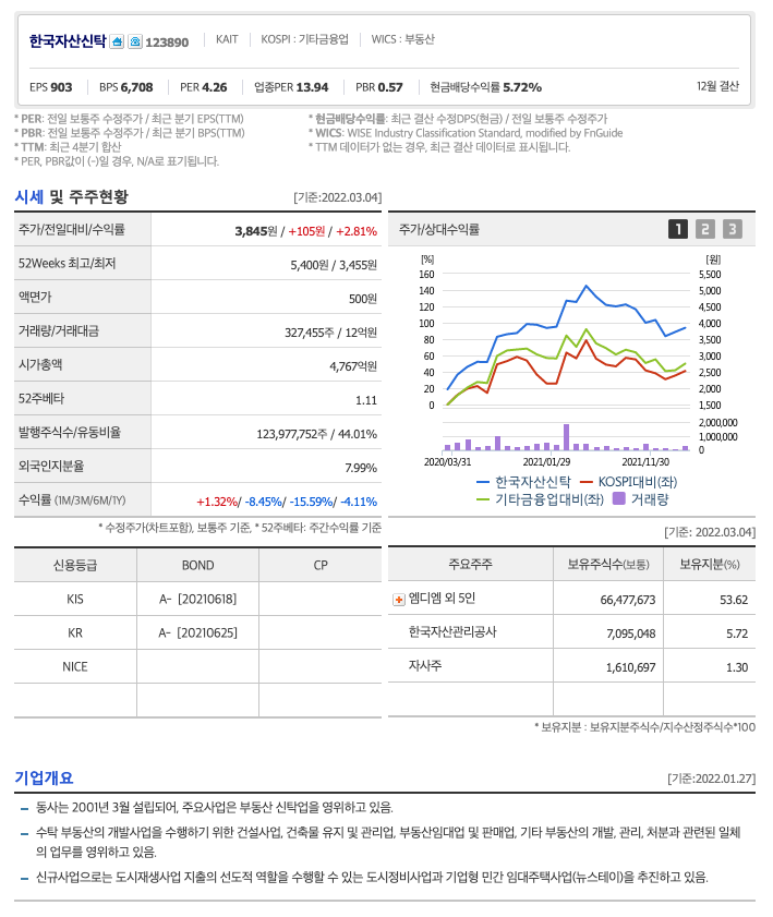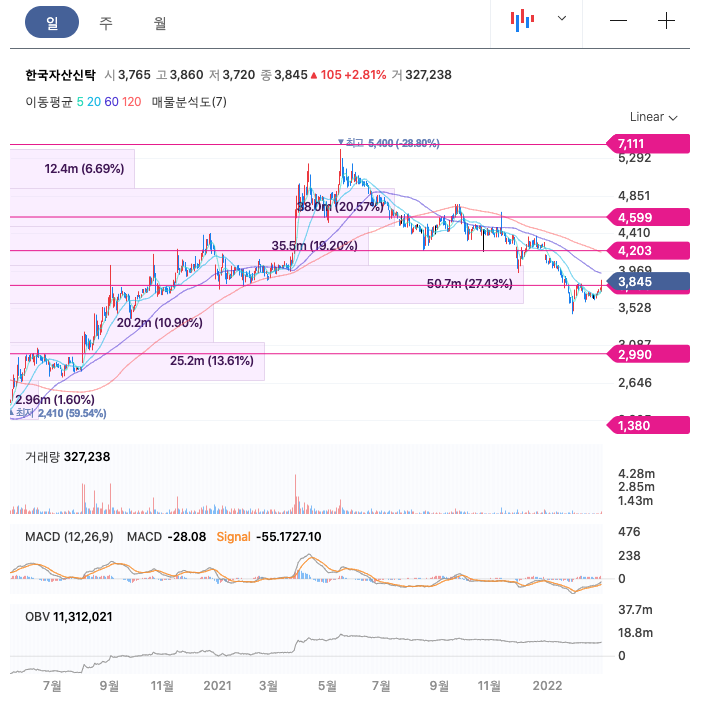 한국자산신탁의 주가는 21년 3월 급등하여 21년 5월 최고 5400원을 찍고 조정을 받았습니다.