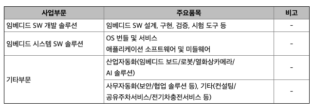 ○ 임베디드 시스템 개발에 필요한 토탈 솔루션을 제공하고 있으며, 솔루션 특성에 따라 임베디드 소프트웨어 개발 솔루션, 임베디드 시스템 소프트웨어, 산업자동화 솔루션 등 기타 사업으로 나뉘어집니다. 각 솔루션별 매출액 및 총 매출액에서 차지하는 비율은 아래와 같습니다.