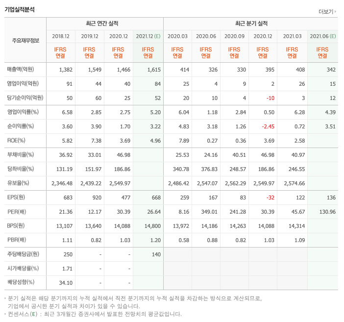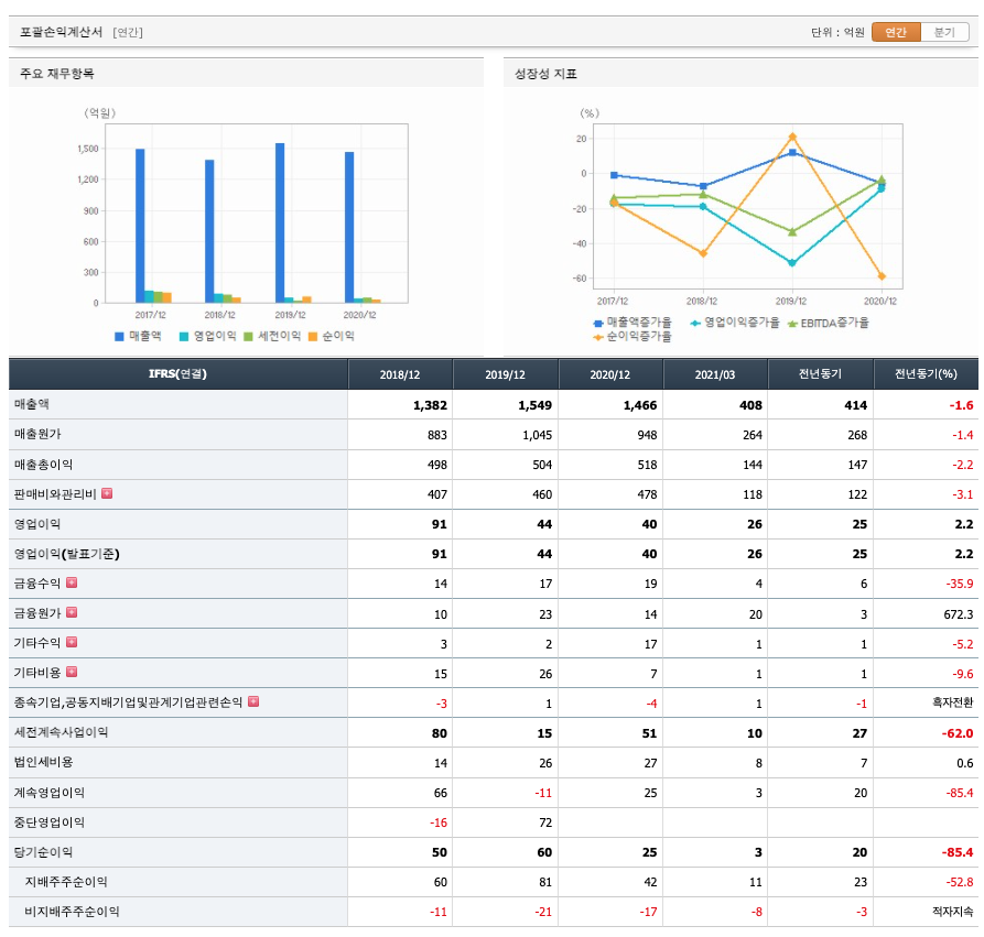 매출액 : 2018년 1382억원, 2019년 1549억원으로 증가, 2020년 1466억원으로 감소, 2021년 1분기 408억원으로 전년동기대비 감소하였습니다. 2021년 1분기는 전년동기대비 -1.6% 감소하였습니다. 2020년 분기별로 보면 2분기 326억원, 3분기 330억원, 4분기 395억원입니다.