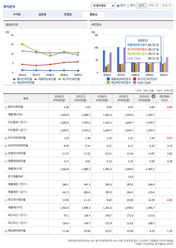 **매출채권회전일수(=돈을 받는 순환일 수, 낮을 수록 좋습니다) 약 65일, 재고자산회전일수(=재고자산 빠지는 일수, 낮을 수록 좋습니다) 약 35일, 매일채무회전일수(=돈을 늦게 줘도 되는 일 수, 높을 수록 좋습니다) 약 39일이고, Cash Cycle(현금회전율, 낮을 수록 좋습니다) 약 60일로 현금운영이 불안정적입니다.