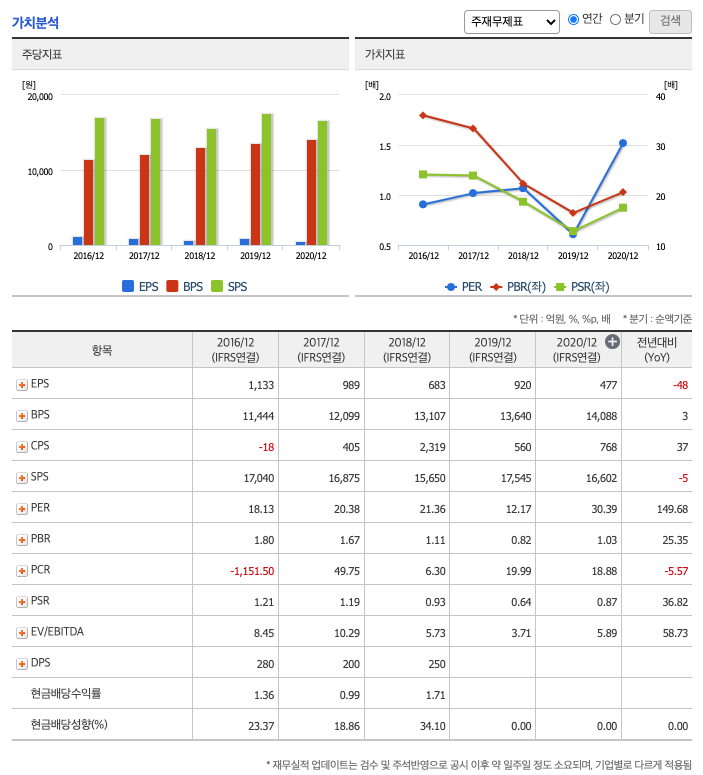 ROE(Return On Equity, 자기자본순이익율, 주주의 관점) : 2016년 약 10.46%, 2017년 약 8.97%, 2018년 약 5.82%로 감소, 2019년 약 7.38%로 증가, 2020년 약 3.69%으로 감소하였고, 자기자본순이익율은 이상율(10%)보다 낮습니다.