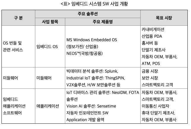 HW형태의 임베디드 솔루션을 별도 구분하고 있습니다. 그 중에서도 열화상 카메라 기반의 영상분석 솔루션, AI HW솔루션, 물류로봇 등을 산업용 자동화 솔루션(스마트팩토리 솔루션)으로 분류하고 있으며, 서비스 로봇, 통신 모듈, 공유주차서비스, 전기차 충전 서비스, 사무자동화 솔루션을 기타로 구분하고 있습니다.