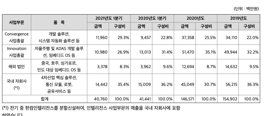 ◇ Innovation 사업총괄 - 미래 자동차 산업을 선도하기 위한 첨단 기술을 제공하며, 스마트 솔루션 제공을 통한 고객 가치 혁신을 위해 도전하고 있습니다. 임베디드OS를 포함한 자율주행, V2X 등으로 대표되는 스마트 자동차 S/W 개발 솔루션을 비롯, 클라우드와 머신데이터분석 솔루션을 제공하며 수익 모델을 공고히 하고 있습니다.