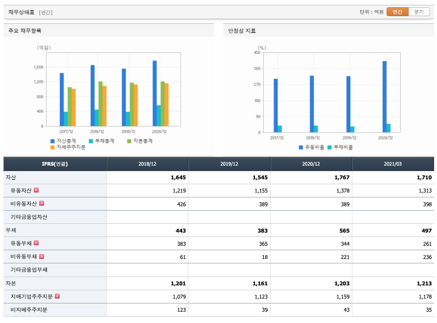 자산은 2018년 1645억원, 2019년 1545억원, 2020년 1767억원으로 증가, 2021년 1분기 1710억원으로 감소하였습니다.
