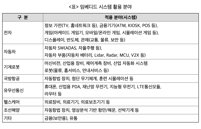 초기 하드웨어 장치를 제어하는 단순한 목적에서 시작한 임베디드 SW는 IoT의 접목 및 네트워킹 기능 발전을 바탕으로 처리 속도, 연결성 등이 확대되는 추세입니다. 90년대 ARM사를 주도로 기존의 시스템과 차별화 되는 프로세서인 IP(Intellectual property)형태를 고안해 내었으며 이 형태를 기반으로 발전하고 있습니다. 에너지 절감, 동적인 기술 등이 요구되며 소프트웨어에 내장할 수 있어 사회적 환경에 빠르게 변화하고 적응하기 위한 다양한 기술이 내장된 임베디드 시스템이 개발되고 있습니다. 이와 더불어 4차 산업혁명 시대의 도래에 따라 자율적 제어가 가능하도록 임베디드SW가 진화할 것입니다. 일례로 스마트팩토리의 경우, 제품의 생애주기 전반에 걸쳐 제품 개발과 제조에 대한 주문, 전달, 유통 단계까지의 가치사슬을 모두 연계하는 서비스가 등장하고 있습니다. 기존의 생산정보화가 가지고 있던 수직적 네트워크와 한정된 정보교환 등의 한계를 극복 가능해지면서 전통 제조업에 임베디드 시스템을 결합한 스마트팩토리가 더 활성화 될 것입니다. 또한, 최근에는 다양한 IoT 센서의 접목, 내장형 인공지능, 3D 프린팅 활용 확대 등 임베디드SW가 보다 지능화되는 경향을 보이며, 임베디드/인텔리전트SW가 발전하고 있습니다. 내장형 인공지능의 역할 및 중요도가 증가하는 점에 따른 산업별 특성에 맞는 데이터 학습, 지능화를 통한 제품 지원이 요구되고 있습니다. 특히 지능형 사물이라는 신규 개념에서 독립형 인공지능 기술은 필수 요소이며, 인간, 주변 환경과 상호작용하는 등 사물인터넷 분야 및 산업 시스템 전반에 많은 변화를 가져올 것입니다.