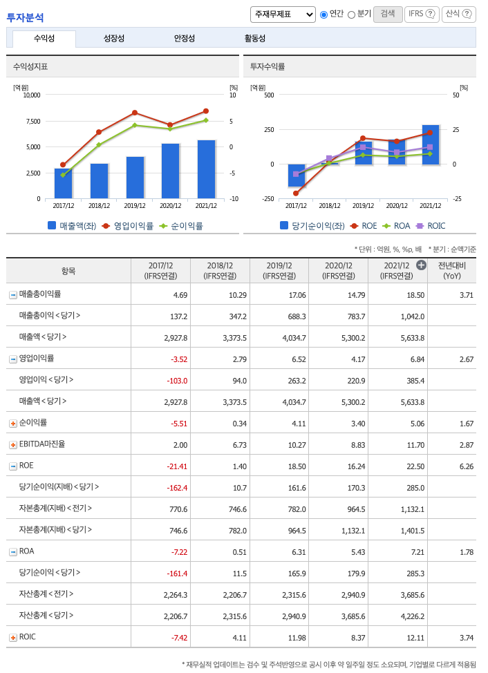 매출액 : 2018년 3374억원, 2019년 4035억원, 2020년 5300억원, 2021년 1,2,3분기 5634억원으로 전년동기대비 증가하였습니다. 2021년 3분기는 전년동기대비 6.3% 증가하였습니다. 2020년 분기별로 보면 4분기 1369억원, 2021년 1분기 1347억원, 2분기 1311억원, 3분기 1607억원입니다.
