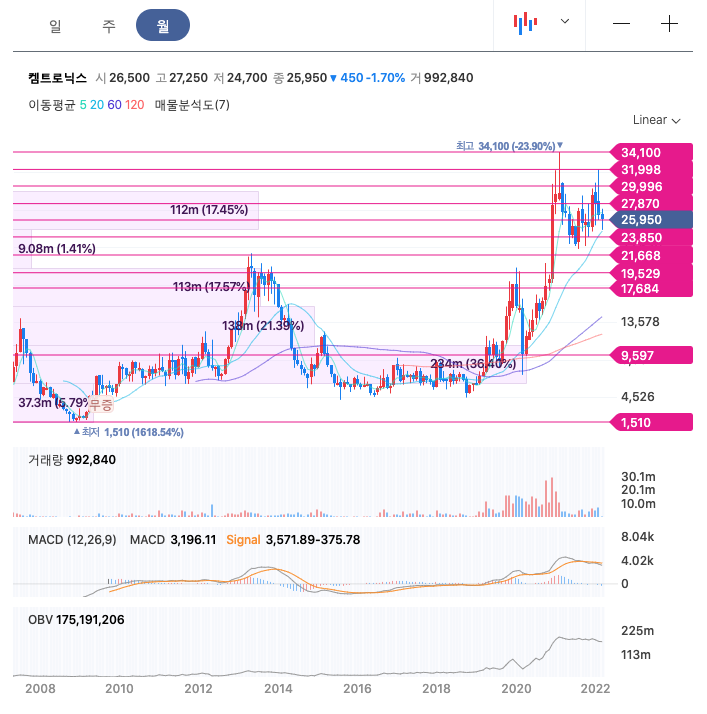 켐트로닉스의 주가는 20년 12월 급등하여 21년 2월 최고 34,100원을 찍고 조정을 받아 보합중에 있습니다.