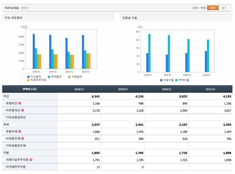 자산은 2018년 4342억원, 2019년 4226억원, 2020년 3832억원, 2021년 1,2,3분기 4193억원으로 증가 하였습니다.