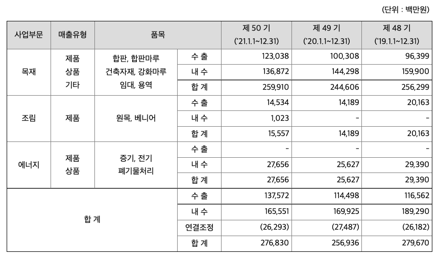 목재부문은 거푸집용 합판을 비롯 건축용 내,외장용 자재에 사용되는 합판 및 마루제품(고급합판 위에 원목을 합친 원목,천연마루 / 고강도 필름을 합친 강마루)을 생산ㆍ판매하고 있으며, 칠레법인은 합판과 함께 합판의 주 원재료인 베니어가 주요 제품입니다. 조림부문은 조림을 통해 생산된 원목을 판매하고 있으며 베니어도 제조, 판매하고 있습니다. 에너지부문은 열병합발전을 통해 증기를 생산, 판매하며 증기생산과정에서 발생하는 전기를 판매하고 있습니다.